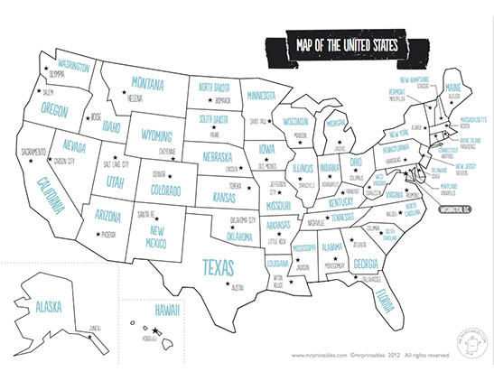 Choose from many options below - the colorful illustrated map as wall art for kids rooms (stitched together like a cozy American quilt!), the blank map to color in, with or without the names of the 50 states and their capitals.
